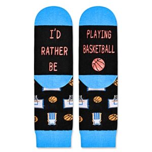 These basketball socks for youth boys feature a basketball, basketball jacket, and hoop design, with a hidden message on the bottom that reads “I’D RATHER BE PLAYING BASKETBALL”.